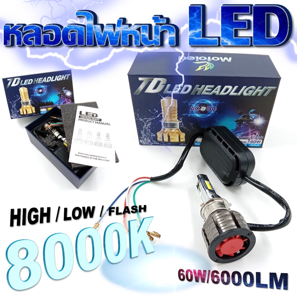 หลอดไฟหน้า LED สำหรับมอเตอร์ไซต์/รถยนต์ 60W ไฟ 3 ระดับ สูง/ต่ำ/แฟลข อุณหภูมิสี 8000K แสงสีขาวนวล (Crystal White)