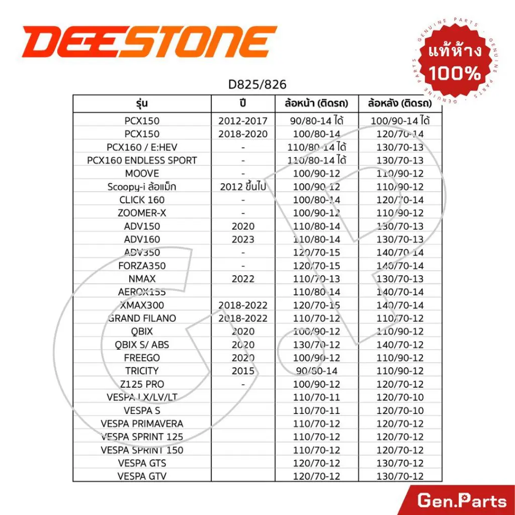 100/80-14 TL d825, 100/80-14 TL D826, 100/90-10 TL D826, 100/90-12 TL D826, 110/70-11 TL D826, 110/70-12 TL D826, 110/70-13 TL D826, 110/80-14 TL D826, 110/90-12 TL D826, 120/70-10 TL D826, 120/70-11 TL d825, 120/70-11 TL D826, 120/70-12 TL D826, 120/70-14 TL d825, 120/70-14 TL D826, 120/70-15 TL D826, 130/70-12 TL D826, 130/70-13 TL D826, 140/70-12 TL D826, 140/70-14 TL D826, 3.00-10 TL D826, 3.50-10 TL D826, 90/80-14 TL D826, 90/90-12 TL D826 |