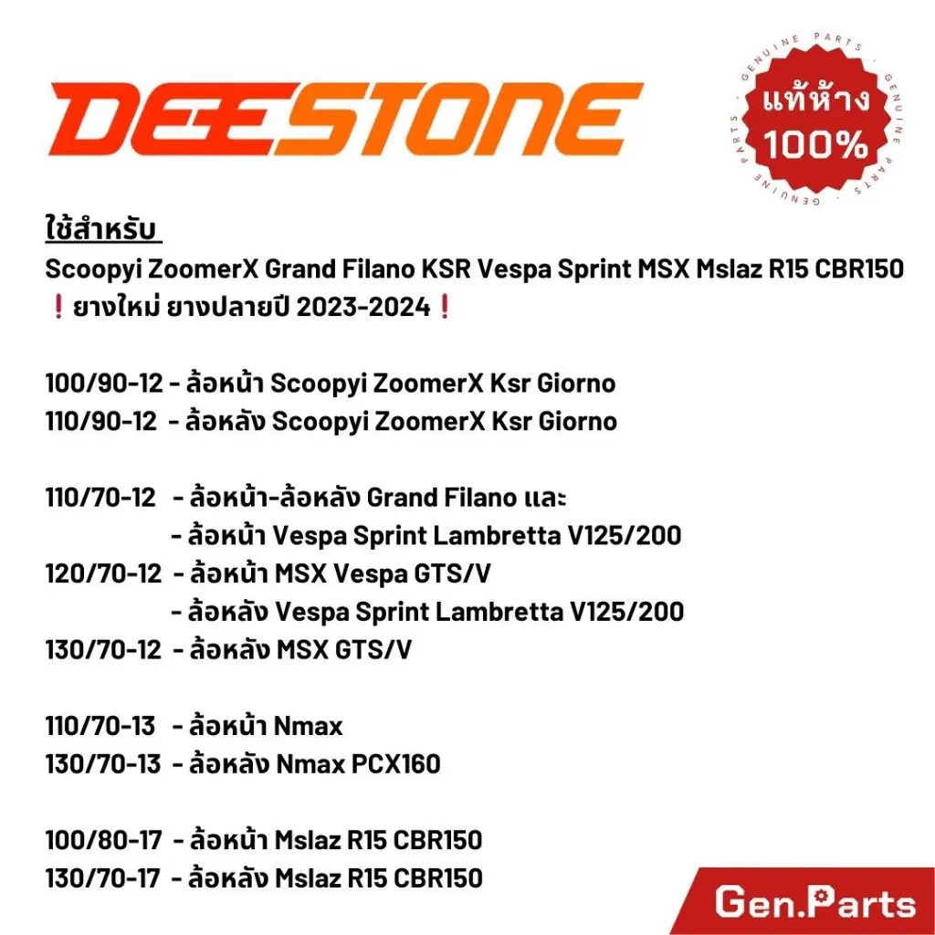 100/80-17 TL, 100/90-12 TL, 110/70-12 TL, 110/70-13 TL, 110/90-12 TL, 110/90-13 TL, 110/90-13 TL 63 năm, 120/70-12 TL, 120/70-14 TL, 130/70-12 TL, 130/70-13 TL, 130/70-17 TL, 130/80-12 TL, 140/70-12 TL, 140/70-14 TL |