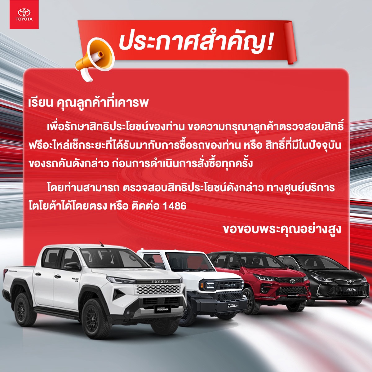 11.สิทธิ์ดังกล่าวไม่สามารถใช้ร่วมกับแคมเปญอื่นๆ ของ บริษัท โตโยต้า มอเตอร์ ประเทศไทย จำกัด