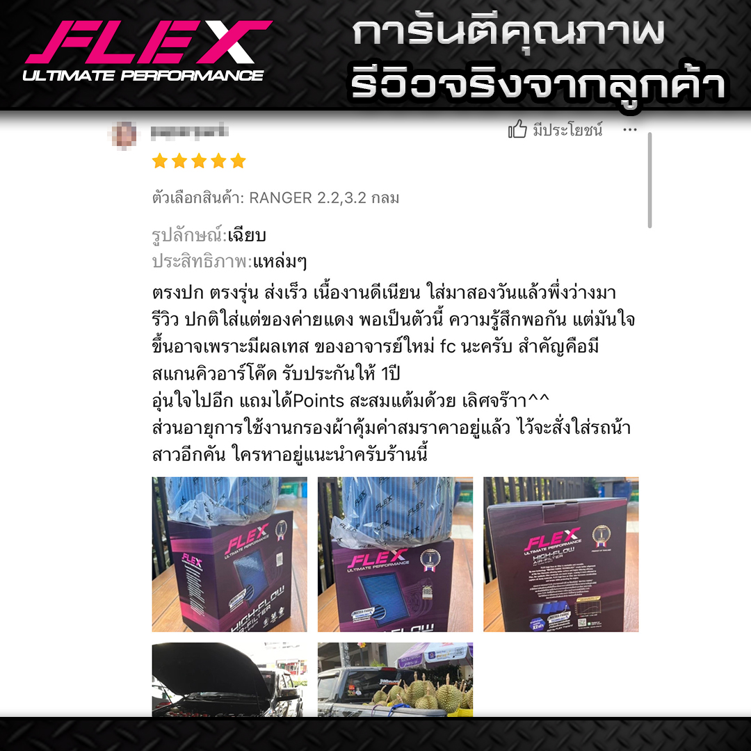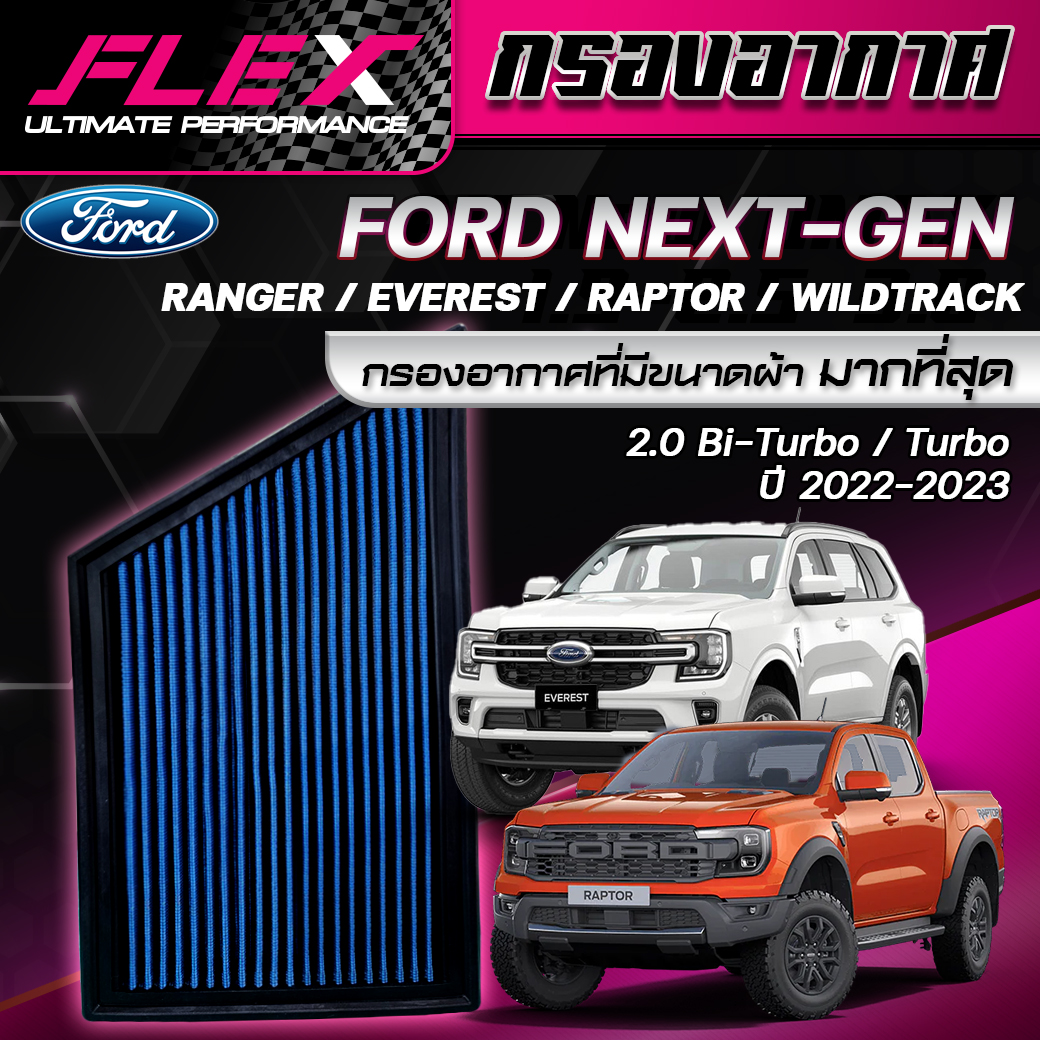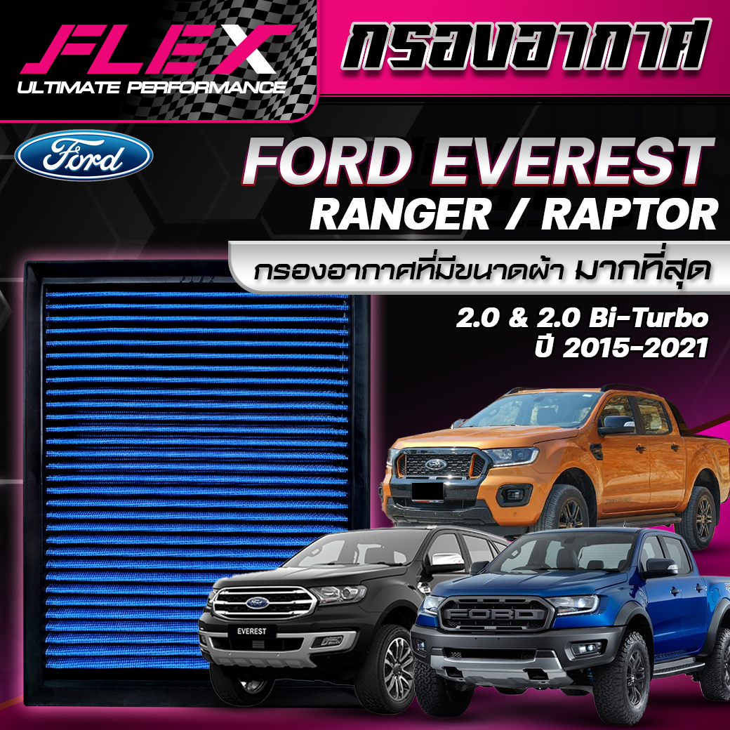 – กรองอากาศ FLEX (แบบแผ่น) FORD EVEREST ทุกรุ่น ปี 2015-ปัจจุบัน / RANGER 2.0 & 2.0 Bi-Turbo ปี 2018 – ปัจจุบัน / RANGER RAPTOR 2.0 Bi-Turbo