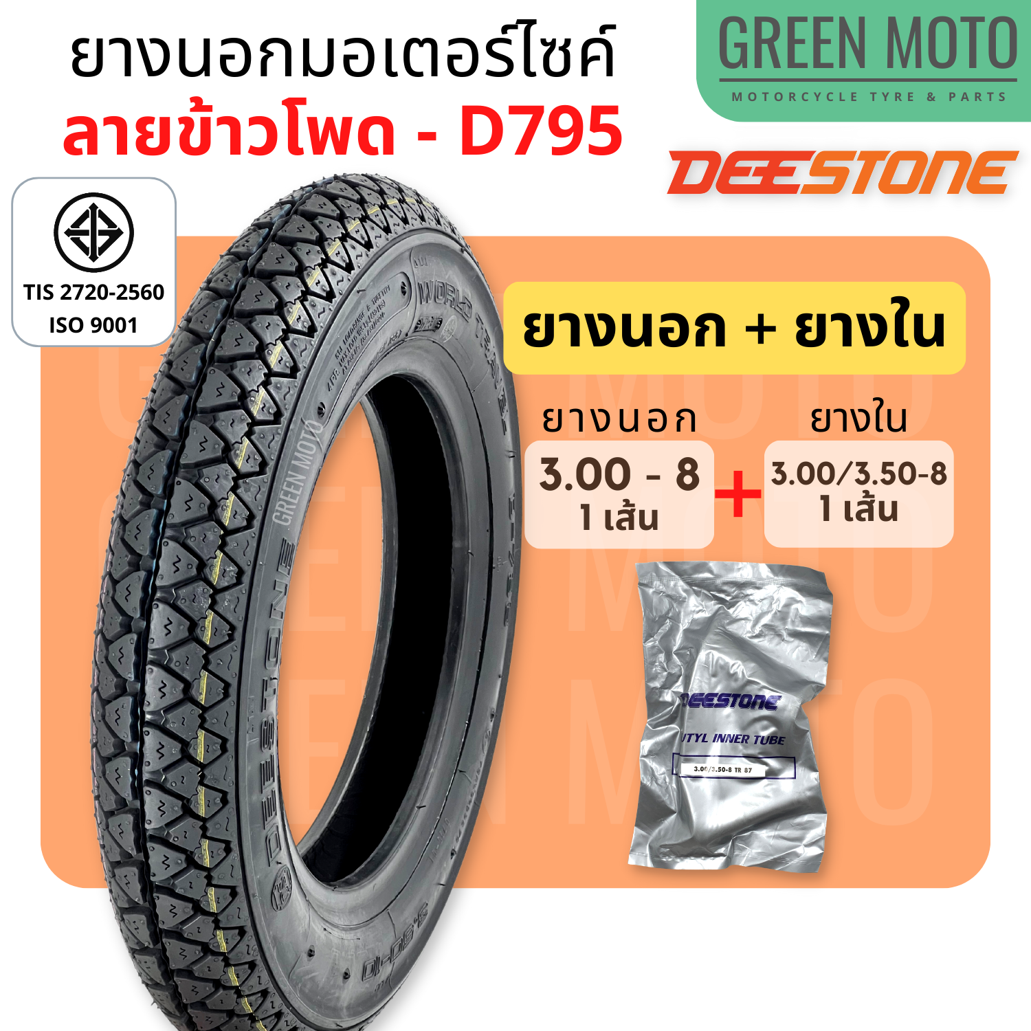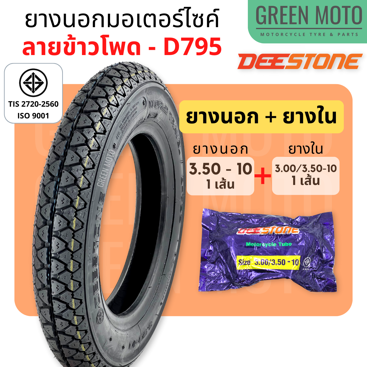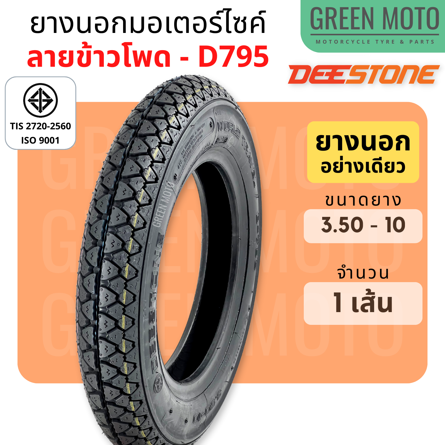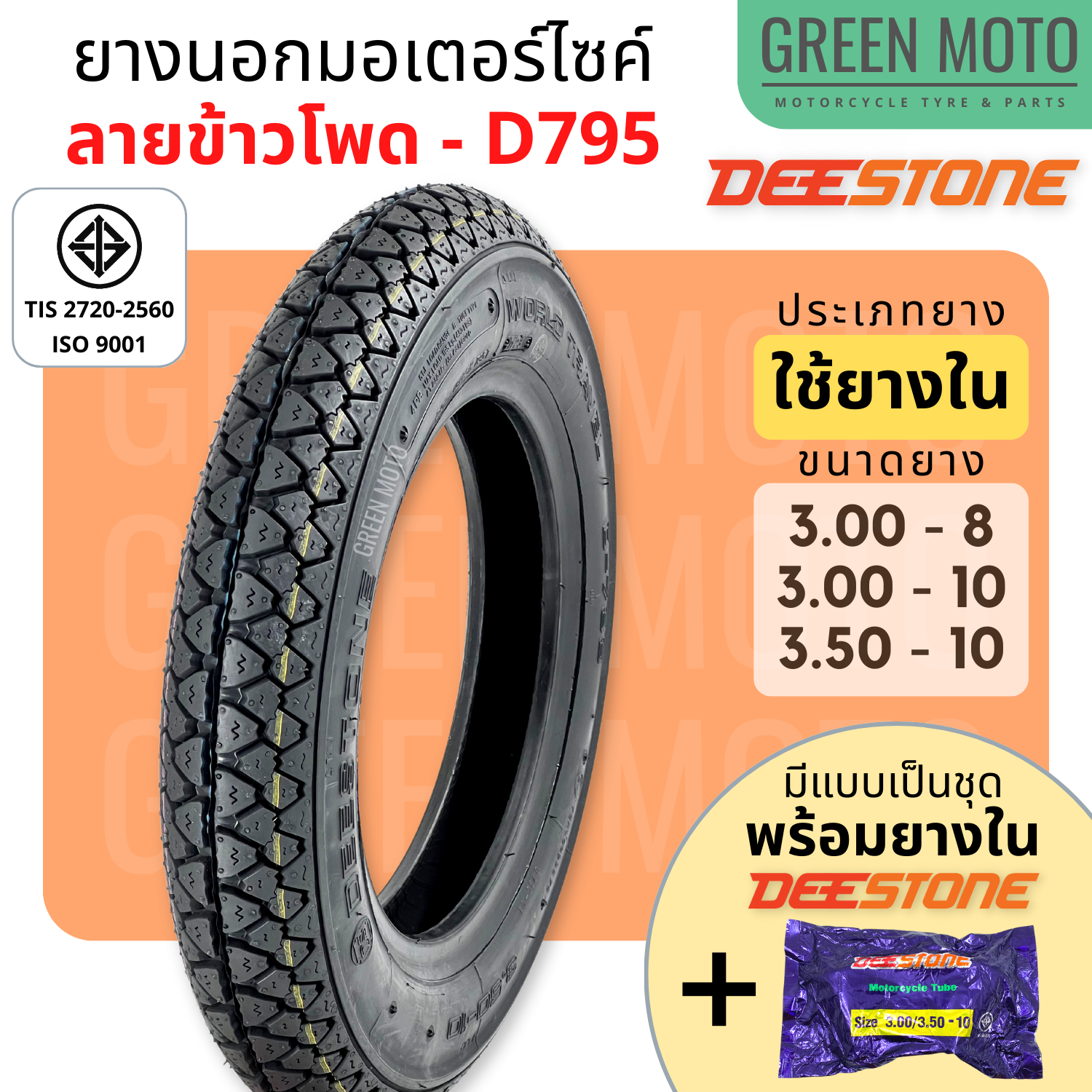 #GREEN-Motorbike #ยางนอกมอเตอร์ไซค์ #Deestone #ดีสโตน #D795 #T/T-(Tube-Type) #ขอบ-10-นิ้ว #3.00-10 #3.50-10