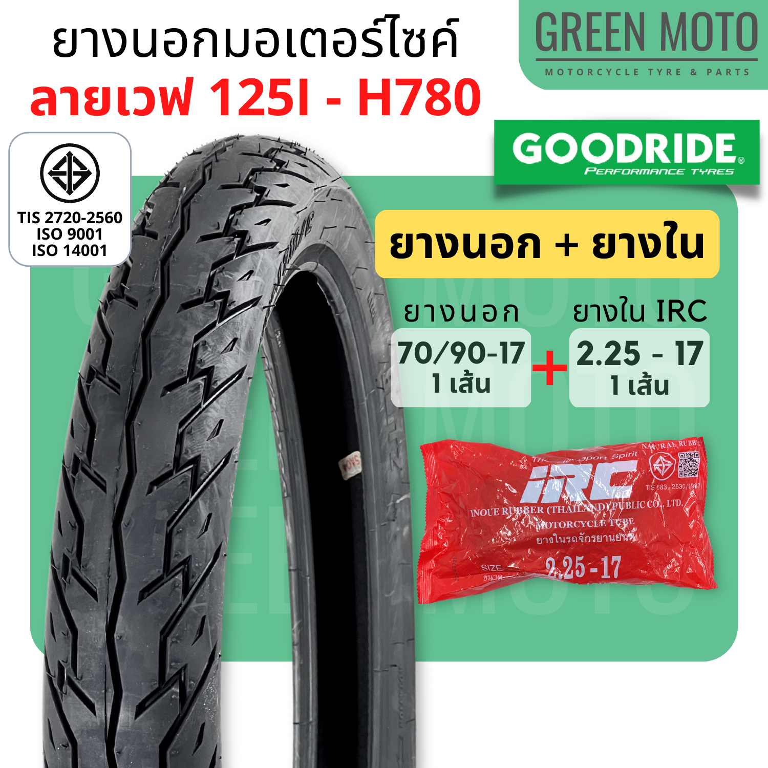 #GREEN-Motorbike #ยางนอกมอเตอร์ไซค์ #GOODRIDE #กู้ดไรด์ #H780-ลายเวฟ-125i #T/T-(Tube-Type) #ขอบ-17-นิ้ว