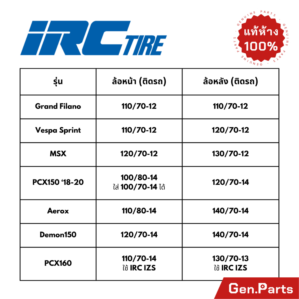 100/70-14 TL, 100/90-12 TL, 110/70-12 TL, 110/70-14 TL, 120/70-12 TL, 120/70-14 TL, 130/70-12 TL, 140/70-12 TL, 140/70-14 TL |