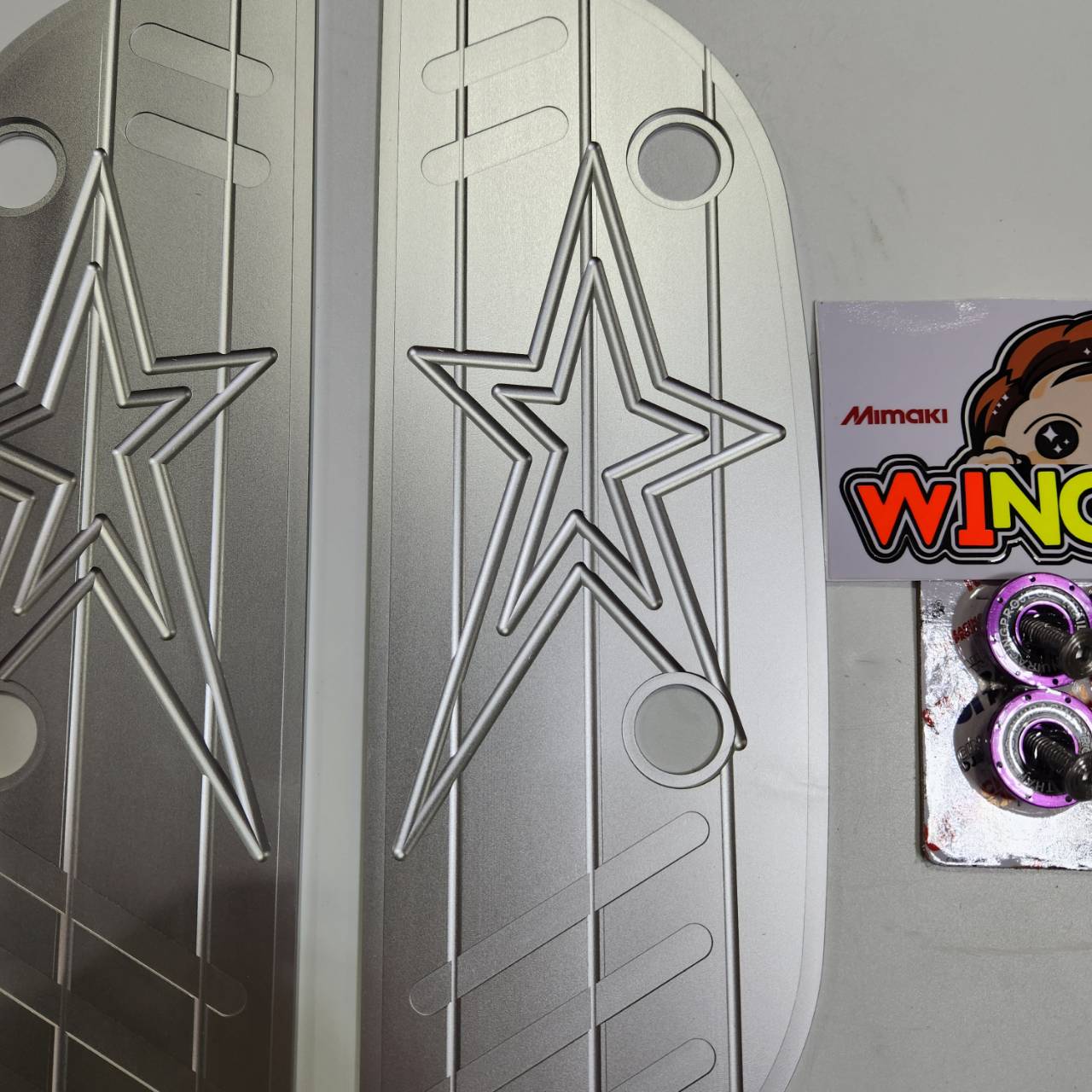 Sàn nhôm GIORNO màu bạc + đế sàn màu tím đen, công việc CNC dày đặc.
